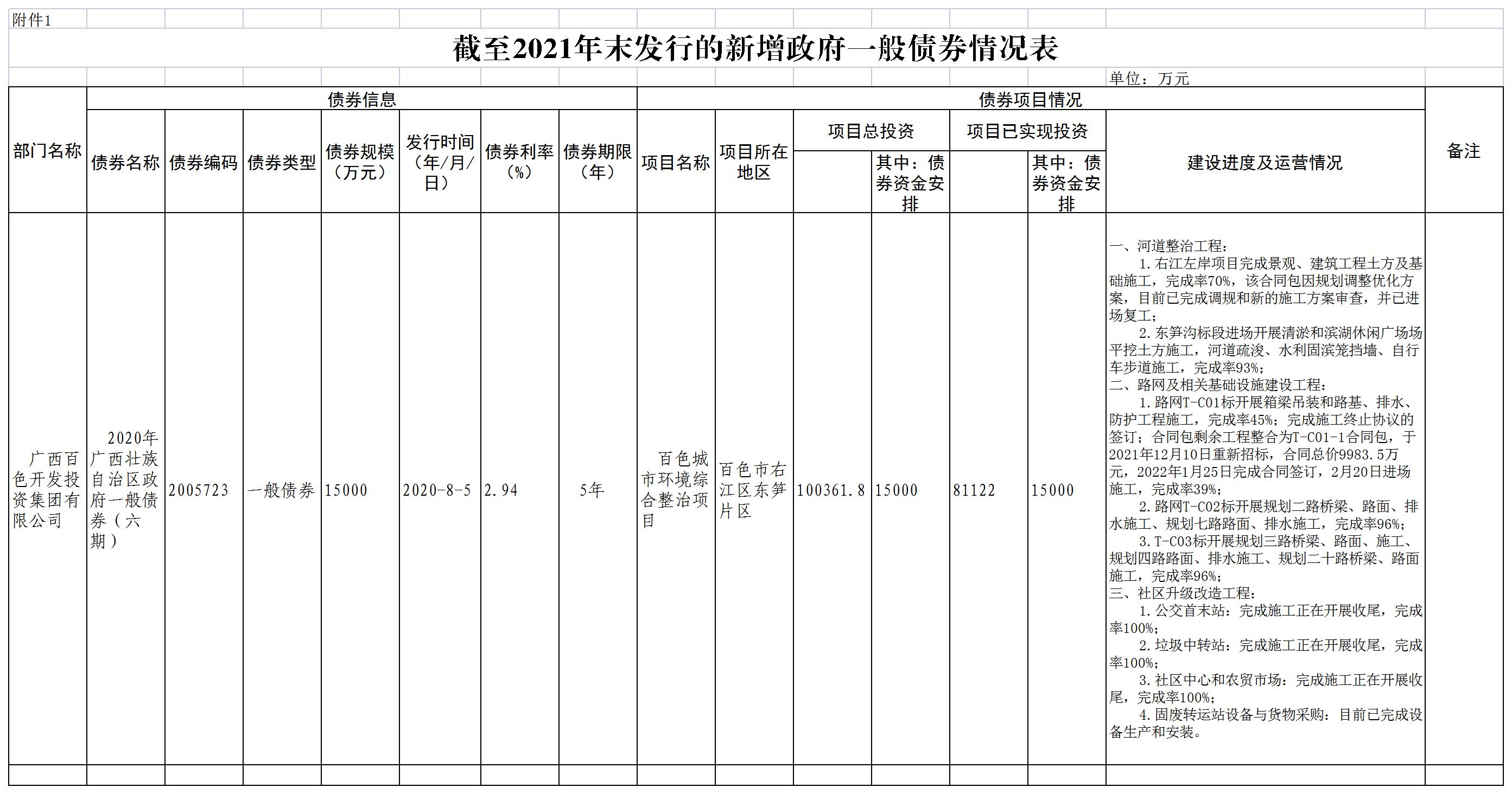 根據(jù)《廣西壯族自治區(qū)財(cái)政廳關(guān)于做好新增政府債券存續(xù)期內(nèi)信息公開有關(guān)工作的通知》(桂財(cái)債〔2022〕61號(hào))和《廣西壯族自治區(qū)財(cái)政廳關(guān)于印發(fā)廣西政府債務(wù)信息公開實(shí)施細(xì)則的通知》(桂財(cái)規(guī)〔2019〕1號(hào))等有關(guān)要求,為做好市本級(jí)新增政府債券存續(xù)期內(nèi)信息公開工作,現(xiàn)將我司新增政府債券存續(xù)期內(nèi)信息公開如下(信息收集截止時(shí)間為2021年末)